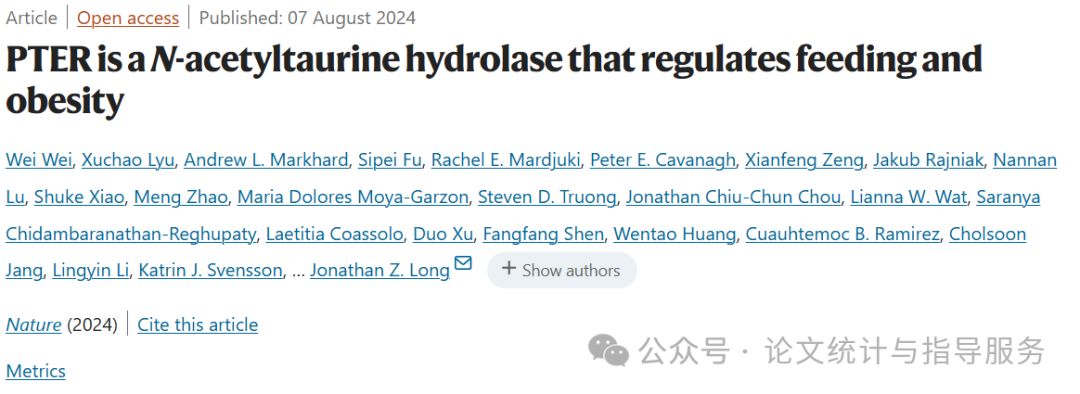 2024年8月7日,斯坦福大学Jonathan Z. Long 团队(魏伟博士为第一作者) Nature 发表了题为 “PTER is a N-acetyltaurine hydrolase that regulates feeding and obesity“ 的研究论文。研究表明,与体重指数相关的孤儿酶——磷酸三酯酶相关酶(PTER)是一种生理性的N-乙酰牛磺酸水解酶。该研究揭示了PTER和N-乙酰牛磺酸在体重控制和能量平衡中的作用。