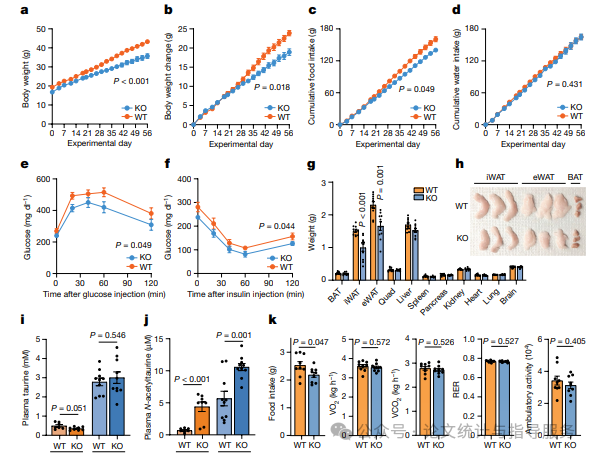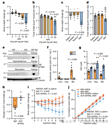 由于N-乙酰牛磺酸在野生型小鼠和Pter基因敲除小鼠之间的积累是主要的代谢产物差异,研究人员试图确定单独给予N-乙酰牛磺酸是否足以再现Pter基因敲除小鼠能量平衡表型的某些方面。研究人员向饮食诱导的肥胖(DIO)小鼠腹腔注射N-乙酰牛磺酸(1-50 mg/kg/天)。在慢性每日给药后,接受N-乙酰牛磺酸治疗的DIO小鼠表现出剂量依赖性的体重(图5a)和食物摄入量减少。为了确定N-乙酰牛磺酸的作用是否需要完整的酰胺化结合物,研究人员将N-乙酰牛磺酸与相同剂量的单独乙酸或单独牛磺酸进行了直接比较(15 mg/kg/天)。接受N-乙酰牛磺酸治疗的小鼠表现出食物摄入量和体重减少,而接受单独乙酸或单独牛磺酸治疗的小鼠与接受载体治疗的小鼠无显著差异。结果表明,向野生型小鼠给予N-乙酰牛磺酸足以减少体重和食物摄入量。