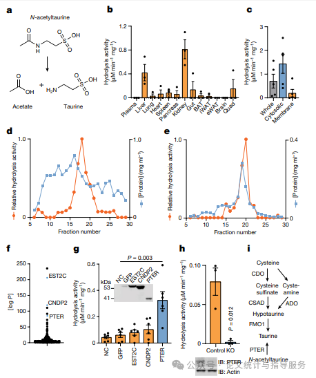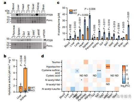 为了确定调节N-乙酰牛磺酸的酶(或酶类),研究人员采用体外酶活性导向法从小鼠组织中检测和纯化N-乙酰牛磺酸水解活性产物。然后将这些蛋白质按Byonic P值排序的,该值衡量了随机识别蛋白质的可能性。该列表中排名最高的酶是酯酶EST2C(也称为CES2C;)、肽酶/合成酶CNDP2和PTER,后者是一种具有未知酶活性或功能的假定金属依赖性水解酶。研究人员将这三种酶的cDNA分别转染到HEK293T细胞中。与转染GFP的对照细胞裂解物相比,转染PTER而非EST2C或CNDP2的细胞裂解物表现出更高的N-乙酰牛磺酸水解活性。与对照细胞相比,在PTER被敲除的HEK293T细胞中,这种水解活性完全丧失。研究人员得出结论,PTER的过表达足以使细胞裂解物获得N-乙酰牛磺酸水解活性。此外,PTER对于HEK293T细胞中的内源性N-乙酰牛磺酸水解活性是必需的。