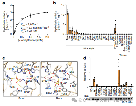 为了研究PTER的酶学特性,研究人员通过细菌中的异源表达产生了纯化的重组小鼠PTER,并使用N-乙酰牛磺酸作为底物来确定其酶活性。结果显示在潜在底物的扫描中,当使用N-乙酰牛磺酸时,PTER的活性最高。为了确定对PTER酶活性重要的活性位点残基,研究人员将N-乙酰牛磺酸对接到AlphaFold建模的PTER结构中,在模拟的活性位点中,研究人员确定了可能与N-乙酰牛磺酸相互作用的残基、金属阳离子以及底物附近的其他活性位点残基。共产生了15种单点突变的细菌重组小鼠PTER蛋白,并在体外检测了它们的N-乙酰牛磺酸水解活性。最后得出结论,PTER在体外是一种N-乙酰牛磺酸特异性水解酶。