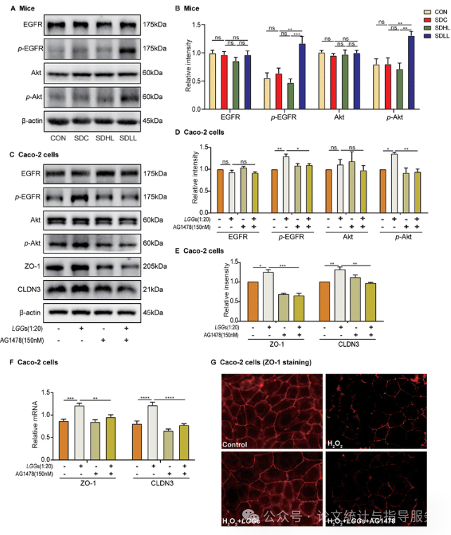 表皮生长因子受体(EGFR)是一种受体型酪氨酸激酶。EGFR的激活在刺激磷脂酰肌醇3-激酶(PI3K)/Akt信号通路以促进细胞增殖和存活中起关键作用。研究人员进一步在体外研究了LGG对EGFR的影响。研究结果显示,LGG促进了EGFR的磷酸化,而不影响总EGFR的表达。数据表明,活LGG可通过激活EGFR来预防睡眠剥夺引起的肠道紧密连接破坏。