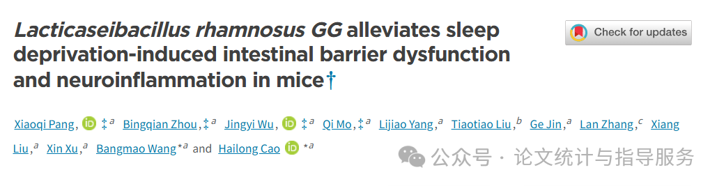2024年8月5日,天津医科大学的研究人员在" Food & Function "期刊上发表了一篇题为"Lacticaseibacillus rhamnosus GG alleviates sleep deprivation-induced intestinal barrier dysfunction and neuroinflammation in mice "的研究论文,该研究探讨了广泛使用的益生菌——鼠李糖乳酪杆菌(LGG)对睡眠剥夺小鼠模型的保护作用。研究结果表明,睡眠剥夺导致小鼠肠道受损,而LGG补充则减轻了肠道屏障的破坏并增强了抗氧化能力。