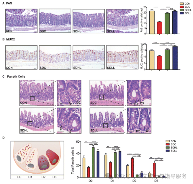 潘氏细胞能够分泌含有抗菌肽(AMPs)的颗粒,这些细胞位于小肠隐窝的底部。研究人员通过评估颗粒的各种形态以及包装在潘氏颗粒中的AMPs水平来评估潘氏细胞的功能。结果显示,睡眠剥夺降低了D0和D1型颗粒的百分比,而活LGG和热处理灭活的LGG均能提高这些颗粒的百分比。