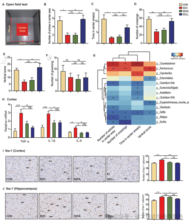 研究人员通过PCR技术检测了小鼠前额叶皮质中炎症细胞因子TNF-α、IL-1β和IL-6的表达。结果显示,睡眠剥夺显著上调了这些炎症细胞因子的表达,而活LGG能够降低其过度表达。研究人员进一步分析了肠道菌群与脑组织测量指标之间的相关性。结果显示,IL-1β与棒状杆菌属呈显著正相关,而与埃希氏菌属/志贺氏菌属呈显著负相关。Iba-1是反映神经炎症状态的小胶质细胞生物标志物。与CON组相比,SD小鼠的大脑皮层和海马体中的Iba-1表达显著增加。