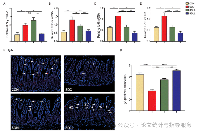 分泌型免疫球蛋白A(sIgA)是最丰富的抗体,在肠道免疫屏障对抗肠道毒素和病原体方面发挥着至关重要的作用。研究人员使用免疫荧光染色法检测了小肠中的sIgA(用白色箭头标记)。图像显示,SDC组中sIgA阳性细胞的数量显著减少,表明在经历睡眠剥夺时,肠道免疫屏障受损。活LGG和热处理灭活的LGG均能促进sIgA的产生,而活LGG的效果更为显著。