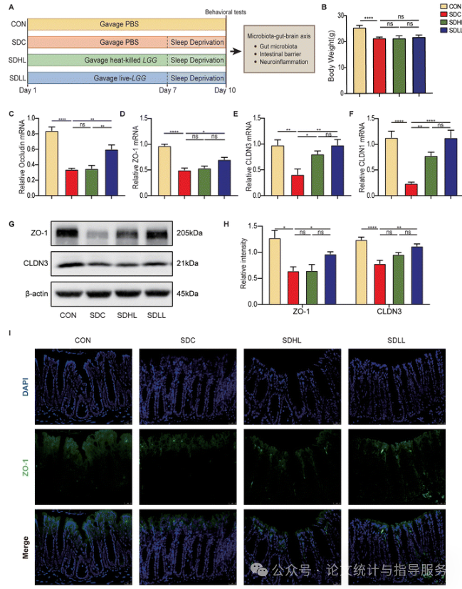 在实验开始前,研究人员所有动物进行了社会接触测试(SPT),以确保研究对象之间的应激水平一致。随后,小鼠被喂食活LGG或热处理灭活的LGG持续10天,并在最后3天接受睡眠剥夺处理。实验期间记录了小鼠的体重变化,所有经历睡眠剥夺的小鼠均表现出显著的体重下降。与SDC组相比,无论是喂食热处理灭活的LGG还是活LGG的小鼠,在体重上均未出现显著差异。
