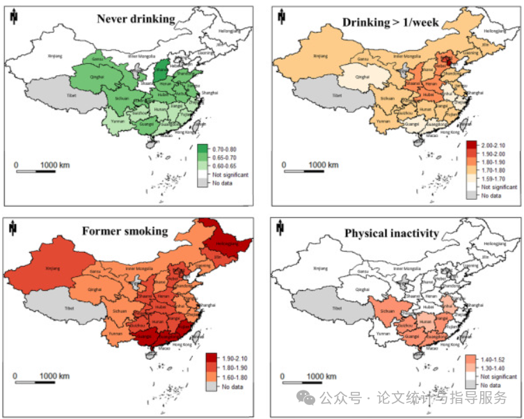 结果显示,与痴呆症显著相关的风险因素包括从不饮酒、每周饮酒超过一次、既往吸烟、身体活动不足、社交孤立、听力障碍、糖尿病和高血压。这些影响在不同省份之间略有差异。与“每周饮酒一次或更少”的状态相比,从不饮酒对痴呆症具有保护作用。其中,福建的保护效应最高。高风险效应“每周饮酒超过一次”的省份主要集中在北部。就吸烟而言,与“从不吸烟”的状态相比,“既往吸烟”的最高风险效应出现在福建,而最低则在云南。在生活方式因素方面,身体活动不足的风险效应在南部显著,从安徽的1.35到广东的1.52。社交孤立的风险效应在吉林最高,在云南最低。在健康状况方面,糖尿病的风险效应范围从北京的1.43到新疆的1.89。听力障碍和高血压在北方的风险效应大于南方,听力障碍的风险效应范围从江西的1.23到天津的2.64,高血压的风险效应范围从广东的1.40到黑龙江的2.26。