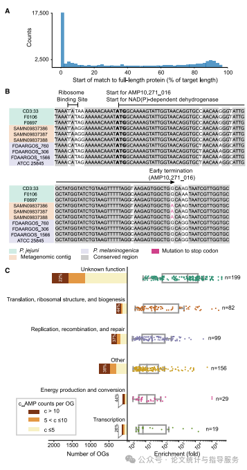 为了研究与AMPs同源的全长蛋白质的功能,研究人员将GMGCv152中的匹配蛋白质映射到eggNOG 5.0中的直系同源组(OGs)。在AMPSphere的匹配结果中,研究人员识别出3,792个(共43,789个)显著富集的OGs(经Holm-Sidak方法多重假设校正后,pHypergeom.< 0.05)。尽管未知功能的OGs占所有识别出的OGs的53.8%,但单独考虑时,这些OGs的平均大小小于其他类别的OGs。因此,尽管每个OG中c_AMP的匹配数量相对较少,但与GMGCv1.52中OGs的背景分布相比,未知功能的OGs在c_AMP匹配中最为富集,平均富集倍数高达10,857倍(pMann ≤ 3.9 × 10−4)。