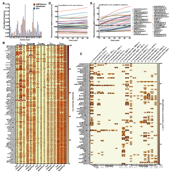 在该研究中,研究团队利用机器学习来预测并编录目前公共数据库中全球微生物组中的AMPs。通过计算分析63,410个公开可用的宏基因组和87,920个高质量微生物基因组,研究人员发现了大量AMP的多样性。此外,研究人员从AMPSphere中合成了100种c_AMPs,并发现其中79种具有活性,其中63种在体外对临床上重要的ESKAPEE病原体(被认为是公共卫生关注的重点)表现出抗菌活性。这些肽类进一步与加密肽(Encrypted Peptides, EPs)进行了比较,EPs是隐藏在蛋白质序列中并通过计算挖掘的肽序列。