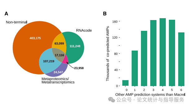 随后,研究团队评估了smORF预测的质量,并在独立的、公开的元蛋白质组或元转录组数据中检测到了AMPSphere中20%(172,840条)的c_AMP序列,这些序列属于AMPSphere中包括的人类肠道、植物等多个栖息地。接着,研究人员对所有c_AMPs进行了一系列计算机模拟的质量测试。其中,一个子集(9.2%或80,213条c_AMPs)通过了所有测试,该子集被后续指定为高质量c_AMPs。使用其他AMP预测系统(AMPScanner v2、ampir中的成熟肽模型、amPEPpy、APIN、AI4AMP和AMPLify)进行测试时,研究人员观察到AMPSphere中98.4%(849,703条肽)的c_AMPs也被至少一个其他AMP预测系统预测为AMP。大约15%(863,498条肽中的132,440条)的AMPSphere c_AMPs被所有使用的方法共同预测。