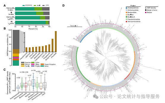 抗菌肽(Antimicrobial Peptides, AMPs)广泛存在于生命体的各个领域中,是由短序列(该研究中操作性地定义为10-100个氨基酸残基)组成的,能够干扰微生物生长的物质。AMPs主要通过干扰细胞壁完整性并导致细胞裂解来发挥作用。天然AMPs可以通过蛋白水解产生,通过非核糖体合成,或者,如该研究所关注的,它们可以在基因组中编码。在自然栖息地中,细菌生活在复杂的对抗与共生平衡中。AMPs在调节这种微生物相互作用中发挥着重要作用,能够排挤竞争者菌株,促进合作。例如,病原菌如志贺氏菌属(Shigella spp.)、葡萄球菌属(Staphylococcus spp.)、霍乱弧菌(Vibrio cholerae)和李斯特菌属(Listeria spp.) 会产生AMPs来消除竞争者(有时是同种内的竞争者),从而占据其生态位。AMPs作为潜在的治疗药物具有广阔前景,并已被临床用作抗病毒药物(如恩夫韦肽和特拉匹韦)。具有免疫调节特性的AMPs目前正在临床试验中,以及可能用于治疗酵母和细菌感染的肽类(如普拉克索、LL-37和PAC-113)。尽管大多数AMPs表现出广谱活性,但也有一些仅对同一物种或属的密切相关成员具有活性。这样的AMPs比传统的广谱抗生素更具靶向性。 此外,与常规抗生素不同,许多AMPs的耐药性进化发生率较低,并且与其他广泛使用的抗生素类别之间不存在交叉耐药性。