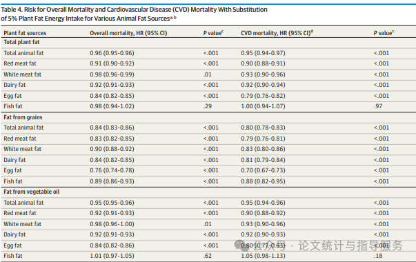 用等量的植物脂肪总量、谷物脂肪或植物油替代总动物脂肪、红肉脂肪、乳制品脂肪或鸡蛋脂肪提供的5%能量,可使总体死亡率风险降低4%至24%,CVD死亡率风险降低5%至30%(P<0.001)。相反,用等量的植物脂肪总量或植物油替代鱼脂肪(或白肉脂肪)并未降低总体死亡率的风险。