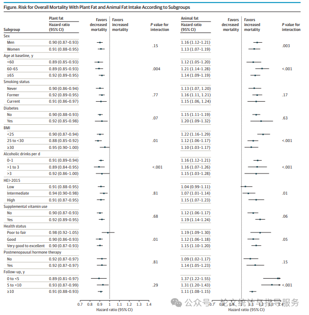 【根据亚组分析,植物脂肪和动物脂肪摄入对全因死亡率的风险】