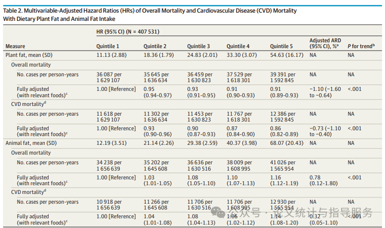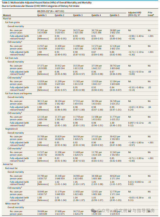【饮食植物脂肪和动物脂肪摄入对全因死亡率和心血管疾病(CVD)死亡率的经多变量调整的危险比(HR)】