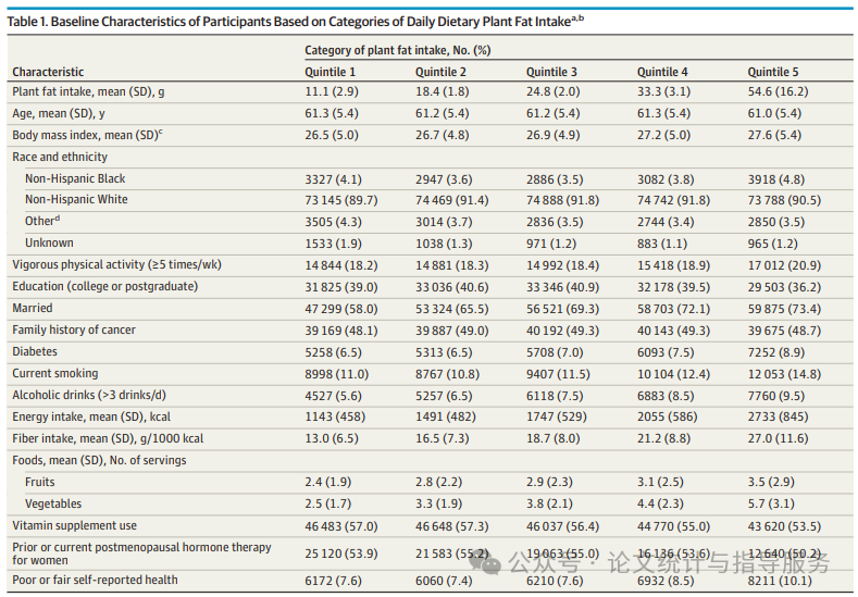 【基于日常饮食中植物性脂肪摄入量的不同分类,参与者的基线特征】