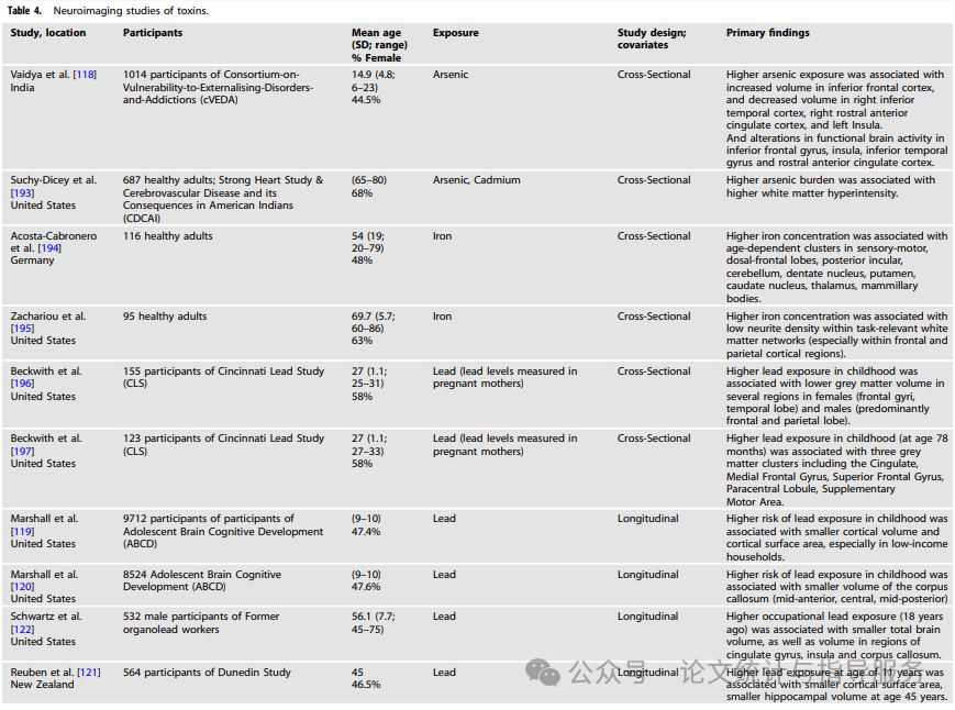 尽管神经毒素并不严格属于微观环境的一部分,但它们是个人可能在其周围环境中接触到的环境因素。人类持续暴露于各种神经毒素之中,包括重金属或类金属(如砷、铅)以及人造化学物质(如多氯联苯(PCBs)、邻苯二甲酸盐)。这种暴露的时机和剂量起着至关重要的作用,并与更显著的影响相关。在所有研究中,均报告了灰质体积(GMV)的变化。这包括由于砷暴露导致的变化,砷暴露主要通过食物或受污染的水进行,这在世界上特定地区尤为严重,包括南美洲、美国和中亚,但也包括由于暴露于铅而导致的变化,铅常用于各种产品,包括管道或汽油,以及由于农药(如有机磷农药)的暴露,这些农药用于保护作物或在全球范围内保存食物,且毒性极高,特别是对婴儿和儿童。
