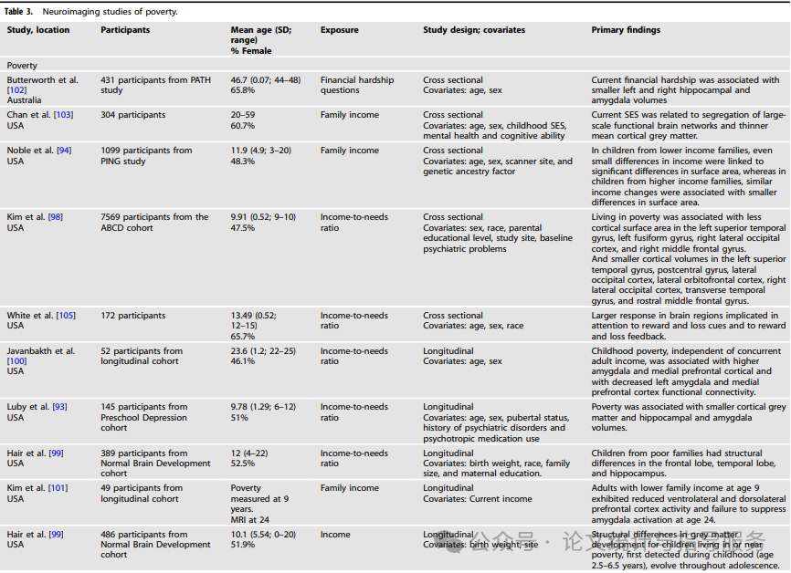 在成年人中,已报告了儿童期SES与当前SES之间的关联。9岁时家庭收入较低与24岁时腹外侧前额叶皮层(vlPFC)和背外侧前额叶皮层(dlPFC)活动减少有关,同时在调节负面情绪时无法抑制杏仁核的激活。dlPFC和vlPFC在认知控制和执行功能中起着至关重要的作用,支持目标导向行为的调节。这些区域以及杏仁核的活动减少与负面情绪调节功能受损有关。在控制了儿童期SES后,中年人的当前SES与海马体和杏仁核体积减少以及平均皮层灰质变薄相关。此外,当前SES还调节了年龄与大脑系统分离之间的关联。与SES较高的中年人相比,SES较低的中年人表现出较低的系统分离度。综上所述,这些发现强调了SES作为影响个体整个生命周期的重要因素的重要性。