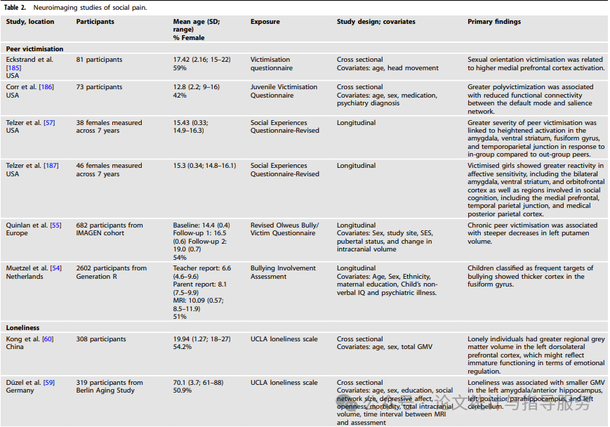 分离、结束一段重要关系或失去亲人被归类为情感丧失。虽然最初可能会出现短暂的亚临床焦虑和抑郁症状,但许多研究也表明存在长期的临床影响,这被称为延长哀伤障碍(PGD)。研究人员没有发现任何大型队列研究调查与情感丧失相关的功能连接(FC),而是回顾了较小规模的研究以收集相关信息。关于一级亲属、配偶去世、失去未出生的孩子、独生子、关系破裂以及宠物去世的fMRI研究报道了疼痛和情绪网络中神经激活的改变,包括扣带回、杏仁核、海马体和眶额叶皮层。关于杏仁核的功能研究表明,其与背外侧前额叶皮层(dlPFC)的高度激活与注意偏向有关,而与喙侧扣带回前部的高度激活与情绪调节障碍有关。参与自传体记忆的后扣带回在悲痛期间也表现出高度激活。最后,还观察到涉及眶额叶皮层的重复性思维。然而,由于样本量小,所报道研究的统计效力有限,这可能导致可重复性问题和I型错误,即存在获得假阳性结果的风险。例如:虽然一项小样本研究(n=32)报告了小脑灰质体积(GMV)增加,但这一结果并未在更大样本(n=192)的研究中得到重复。虽然关于结构MRI的研究数量较少,但另一方面,这些研究招募了更大规模的样本(n~190)或嵌套在队列研究中:鹿特丹队列(5501名参与者)。这些研究将情感丧失与较小的GMV联系起来,特别是杏仁核中的GMV。