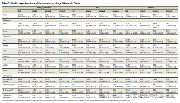 平均而言,城市居民健康但不在工作的年数则是农村人口的1.6倍(4.92年,相比农村人口的2.97年;差异为1.95年)。