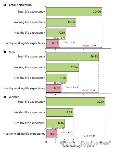 【健康工作寿命预期与健康寿命预期、工作寿命预期和总寿命预期之间的差距】