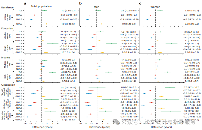 就教育水平而言,随着教育水平的提高,健康工作寿命预期(HWLE)和不健康工作寿命预期(UHWLE)均有所下降,而总寿命预期(TLE)和健康但不在工作寿命预期(HNWLE)则呈现相反的情况。低教育水平个体相比高教育水平个体,需要多工作2.64年才能保持健康。相反,高教育水平人群健康但不在工作的年数更长。尽管总寿命预期(TLE)在不同收入水平之间存在显著差异(5.78年),但无论是在总人群还是男性和女性中,健康工作寿命预期(HWLE)均未随收入水平变化而变化。