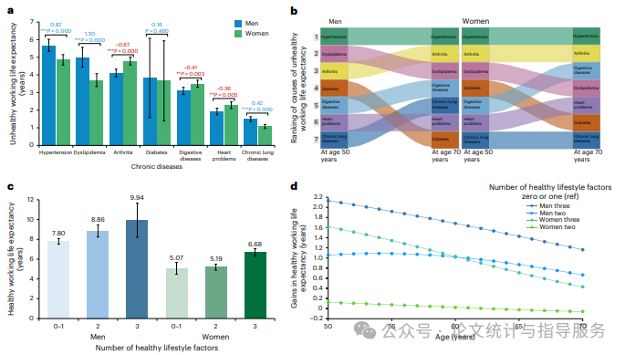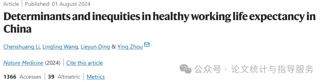 2024年8月1日,华中科技大学的学者在Nature的子刊Nature medicine发表题为 “Determinants and inequities in healthy working life expectancy in China”的研究论文,研究发现,在中国,50岁时的HWLE平均为6.87年。高血压是导致人们不健康工作的主要慢性疾病(男性为5.67年,女性为4.85年),而关节炎则导致了不同职业人群之间不健康工作年数的最大差异(农业劳动者与企业员工之间相差3.28年)。此外,采用健康的生活方式与HWLE的增加有关(男性增加2.13年,女性增加1.61年)。
