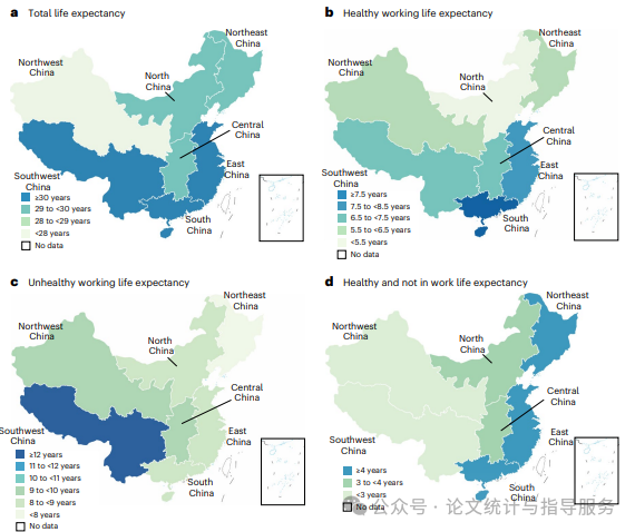 华东地区的总健康工作寿命预期最高(30.79年,),而西北地区的总寿命预期最低(27.28年)。健康工作寿命预期(HWLE)呈现南北差异,从华北地区的4.97年到华南地区的9.02年。健康但不在工作寿命预期(HNWLE)则呈现西东差异,从西北地区的2.56年到华南地区的4.76年。此外,不健康工作寿命预期(UHWLE)从西南地区的12.03年逐渐下降至东北地区的7.33年。