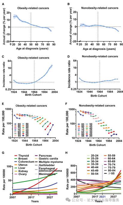 【观察到的(2007-2021年)和预测的(2022-2031年)肥胖相关及非肥胖相关癌症的年龄特定平均年度变化百分比(AAPCs)、发病率比率和按出生队列划分的年龄特定发病率】