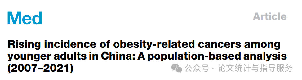 2024年8月23日,首都医科大学附属北京同仁医院杨金奎教授团队在Cell Press旗下期刊Med 上发表了题为 “Rising incidence of obesity-related cancers among younger adults in China: A population-based analysis (2007–2021)”的研究论文,研究发现,在651,342例癌症病例中,48.47%与肥胖相关。12种肥胖相关癌症的年龄标准化发病率(ASR)每年上升3.6%,而非肥胖相关癌症的ASR则保持稳定。肥胖相关癌症在年轻成人中激增,且发病率随代际递增。年度变化百分比随年龄增长而下降,从25-29岁年龄组的15.28%降至60-64岁年龄组的1.55%。与1962-1966年出生的人群相比,年轻一代肥胖相关癌症的发病率比更高。
