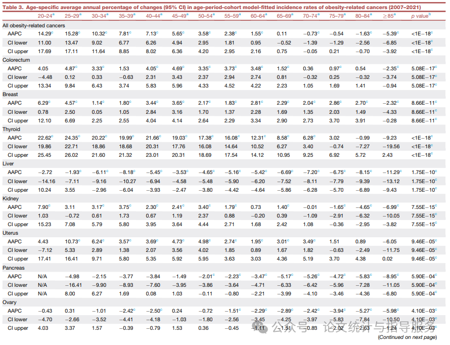 【2007年至2021年间,基于年龄-时期-队列模型拟合的与肥胖相关癌症发病率的年龄特定平均年度变化百分比】