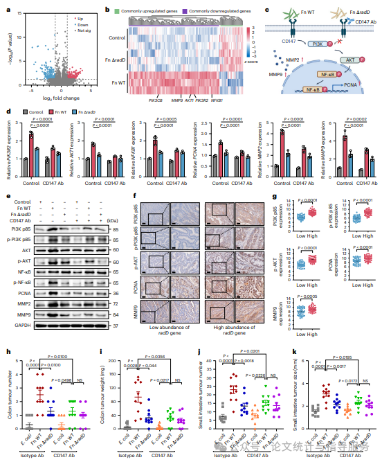 为了探究RadD与CD147相互作用介导的下游信号通路,研究人员对与野生型纤连蛋白(Fn WT)或缺失RadD的纤连蛋白(Fn ∆radD)共孵育的HCT116细胞进行了基因表达谱分析。结果表明具核梭杆菌通过RadD-CD147相互作用激活PI3K-AKT-NF-κB-MMP9信号转导途径。
