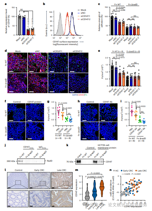 识别能够与RadD结合的宿主细胞受体对深入了解具核梭杆菌(F. nucleatum)的发病机制至关重要。研究表明,RadD通过其表面蛋白RadD与CD147受体的结合,介导了具核梭杆菌对CRC细胞的粘附。接下来,研究人员探讨了CD147表达水平的升高是否与RadD表达型具核梭杆菌在CRC组织中的定植增加有关。结果表明具核梭杆菌RadD与肿瘤表达的CD147之间存在特异性相互作用,可能导致具核梭杆菌在CRC组织中的定位和富集。