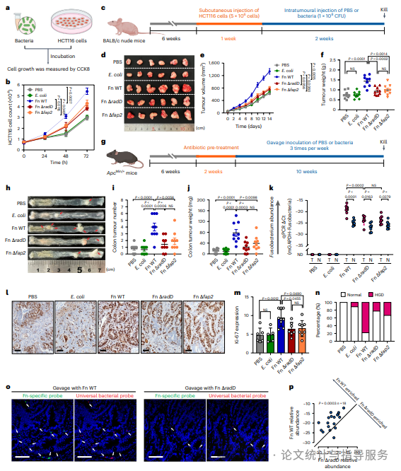 接下来,研究团队研究了RadD是否能够促进CRC细胞的增殖。结果表明,RadD对于具核梭杆菌(F. nucleatum)促进CRC细胞增殖是必要的。随后,研究人员使用ApcMin/+小鼠(一种自发性CRC的遗传小鼠模型)进一步探讨了RadD对结直肠癌发生的影响。研究结果表明RadD对于具核梭杆菌在结肠肿瘤组织中的定位和富集至关重要,从而在ApcMin/+小鼠中发挥其致癌作用。