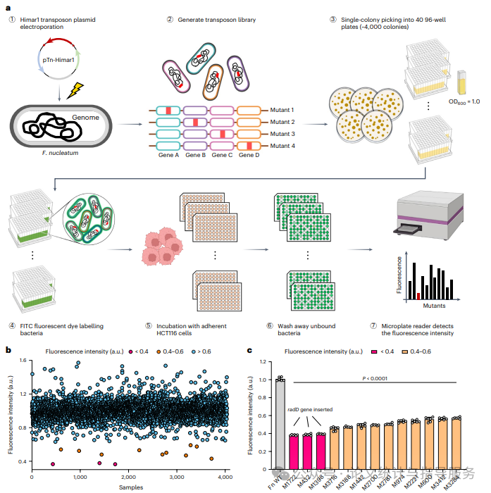为了确定具核梭杆菌(F. nucleatum)黏附于结直肠癌(CRC)细胞所必需的基因,研究人员使用基于转座子系统的随机诱变库,该系统特别适用于高AT(腺嘌呤和胸腺嘧啶)含量的细菌,如具核梭杆菌。从该库中挑选出约4000个克隆,用荧光染料异硫氰酸荧光素(FITC)标记,并与CRC细胞系HCT116在96孔板中共孵育。结果表明RadD在介导F. nucleatum与CRC细胞之间的黏附中发挥作用。