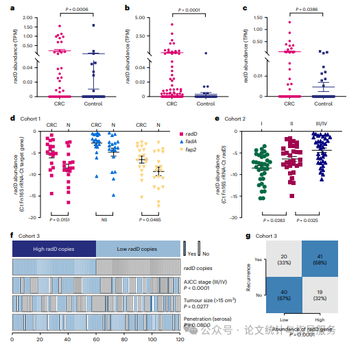 为了评估radD在具核梭杆菌在结直肠癌(CRC)中定位的作用,研究人员分析了来自队列1中18名患者的CRC组织及其邻近非癌组织中的radD基因丰度。研究表明,radD基因的高丰度可能促进了具核梭杆菌在CRC中的富集。接下来,研究团队研究了队列2中radD基因丰度与美国癌症联合委员会(AJCC)分期之间的关系。数据表明,radD基因丰度在临床上与CRC进展相关。