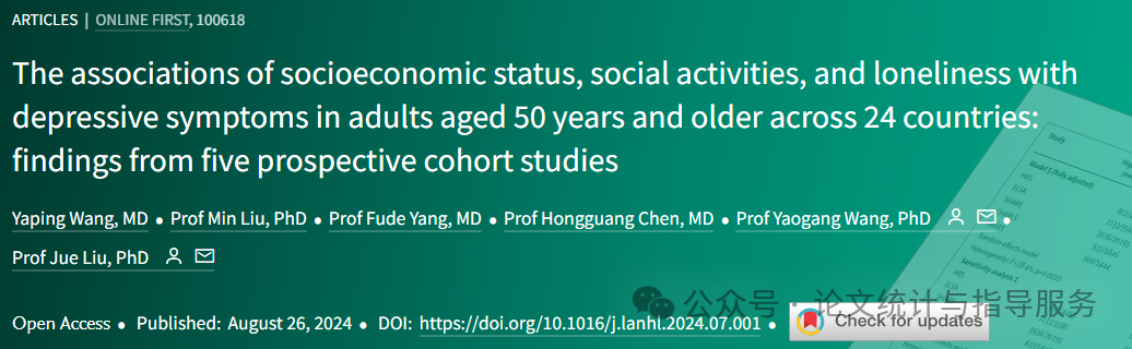 2024年8月26日,北京大学研究团队在Lancet子刊Health Longevity发表了题为 “The associations of socioeconomic status, social activities, and loneliness with depressive symptoms in adults aged 50 years and older across 24 countries: findings from five prospective cohort studies” 的研究论文,研究发现,与社会经济地位高的参与者相比,社会经济地位低的参与者患抑郁症的风险更高。社交活动和孤独感在社会经济地位与抑郁症关联中的中介作用比例分别为6.12%和5.54%。仅观察到社会经济地位和孤独感对抑郁症有显著的乘法交互作用。与社会经济地位高、社交活跃且不孤独的参与者相比,社会经济地位低、社交不活跃且孤独的参与者患抑郁症的风险更高。(如需获取原文,请在公众号扣6)
