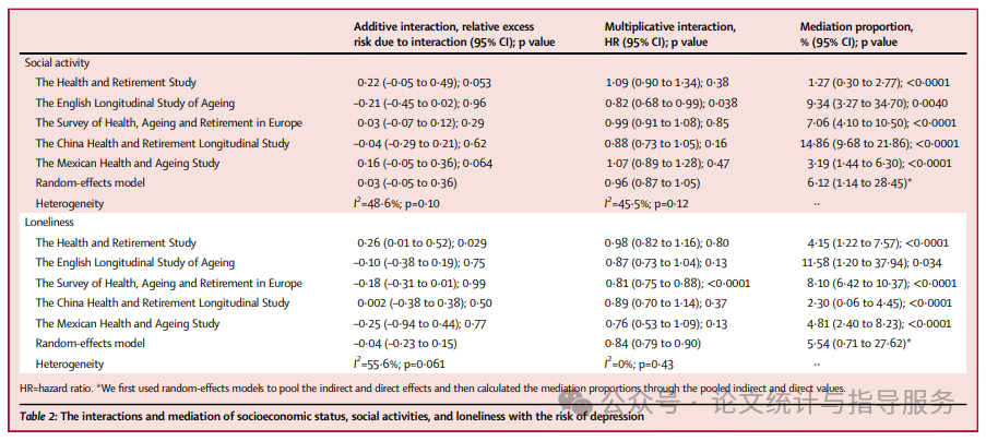 在中介分析中,社交活动在社会经济地位与抑郁症关联中的中介比例为6.12%,孤独感的中介比例为5.54%。五个老龄化调查中的中介比例各不相同,社交活动的中介比例从HRS的1.27%到CHARLS的14.86%不等,孤独感的中介比例从CHARLS的2.30%到ELSA的11.58%不等。