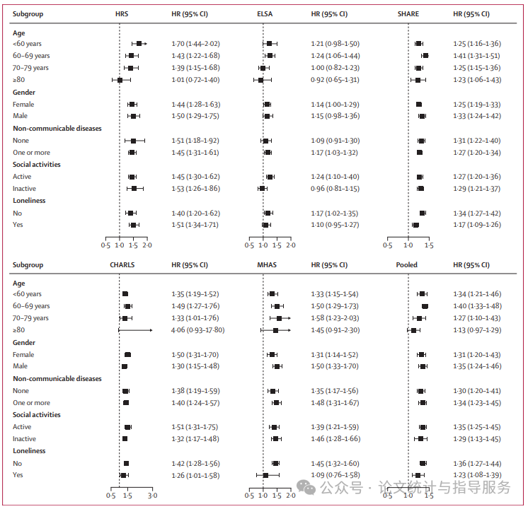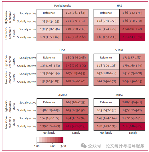 在合并结果中,与参考组(高社会经济地位、社交活跃且不孤独)相比,低社会经济地位、社交不活跃且孤独的群体患抑郁症的风险最高。低社会经济地位、社交不活跃且孤独的群体患抑郁症的风险高于其他任何变量取值相反的组别。