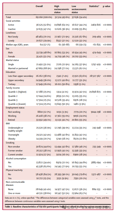 【五项队列研究中69,160名参与者的基线特征(按社会经济状况分类)】