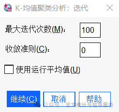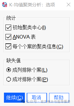 ④ 单击“选项”按钮,勾选“初始聚类中心”、“ANVOA表”和“每个个案的聚类信息”,点击“继续”,最后点击“确定”