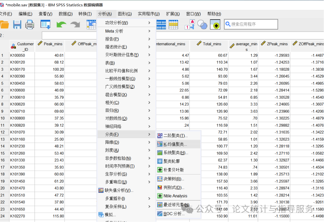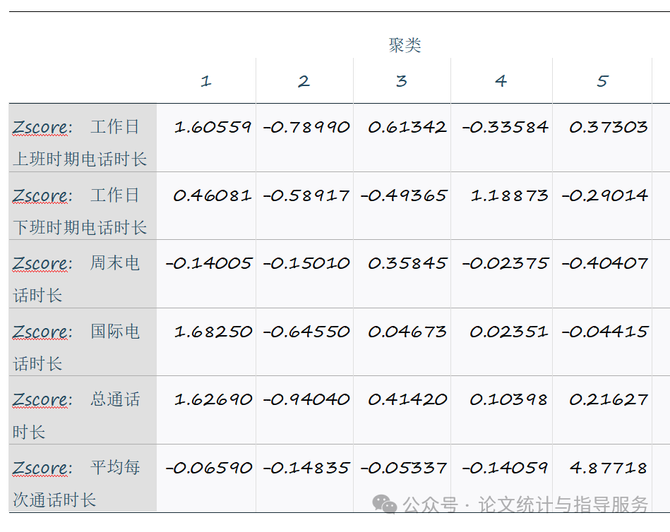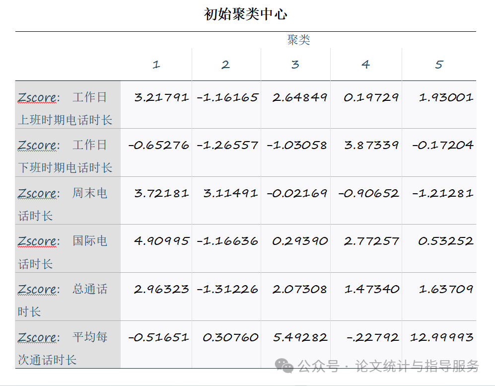 案例:某研究者为了研究移动电话客户使用收集情况,收集了以下数据集,包括6个变量,分别为工作日上班时期电话时长、工作日下班时期电话时长、周末电话时长、国际电话时长、总通话时长和平均每次通话时长。研究者希望对移动电话用户进行细分,了解他们不同的手机消费习惯。根据前期调研,研究者希望对移动用户进行细分,以了解他们不同的手机消费费习惯。根据前期调研,研究者认为移动用户应被分为5个主要群体,现希望根据定量聚类结果,以对各类别采取不同的市场营销措施。