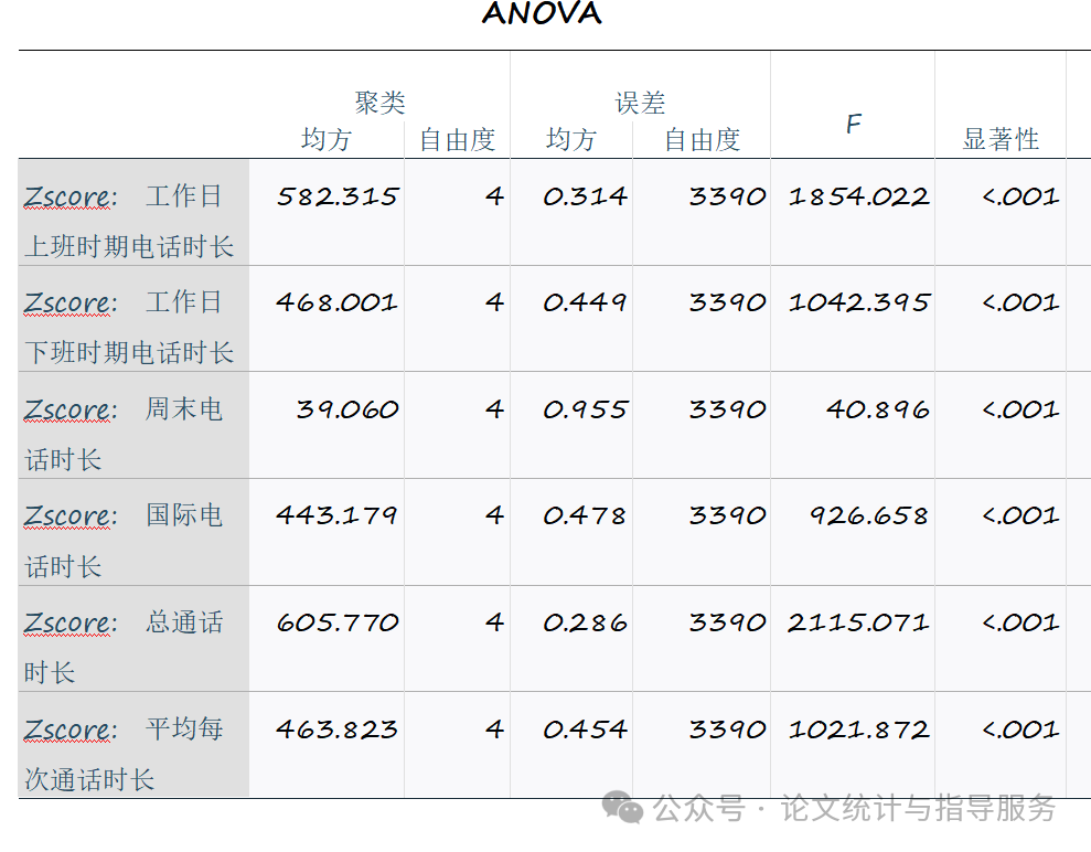 表3、给出了最终聚类中心,指的是各个变量在各个类别的平均值。
