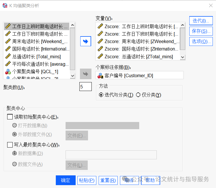 ② 将所有变量选入“变量”框中,将“客户编号”选入“个案标注依据”中,在“聚类数”框输入5.