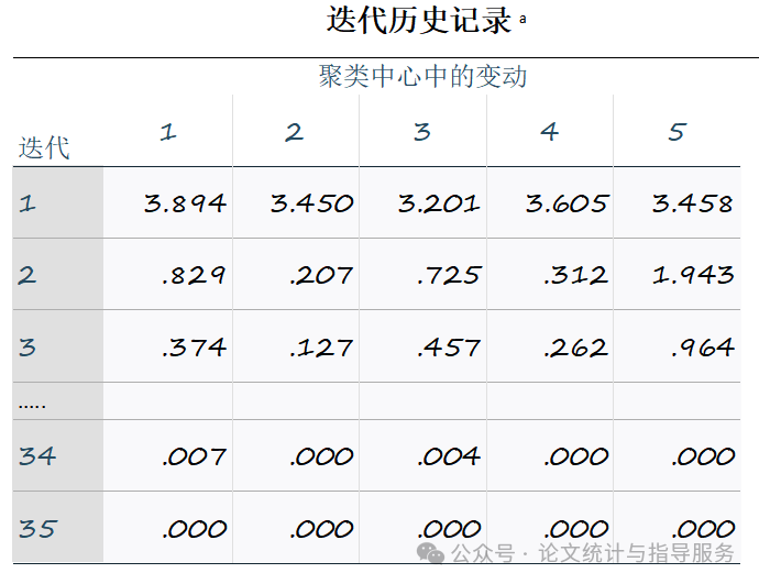 表2:迭代历史记录,该表数据随着迭代次数增加,聚类中心变化越来越小,直至趋近于0。本案例在第35次迭代的时候终止,各聚类中心已收敛。