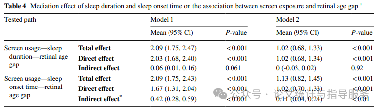 屏幕暴露时间缩短了睡眠时间并加速了衰老。然而,睡眠时间并不是屏幕暴露时间与视网膜年龄差距之间的中介变量。在路径分析中,研究人员观察到入睡时间介导了屏幕使用对视网膜年龄差距的影响,而睡眠时间则没有。具体而言,更长的屏幕使用时间可能会延迟入睡时间,从而增加视网膜年龄差距。间接效应的比例为10.1%。