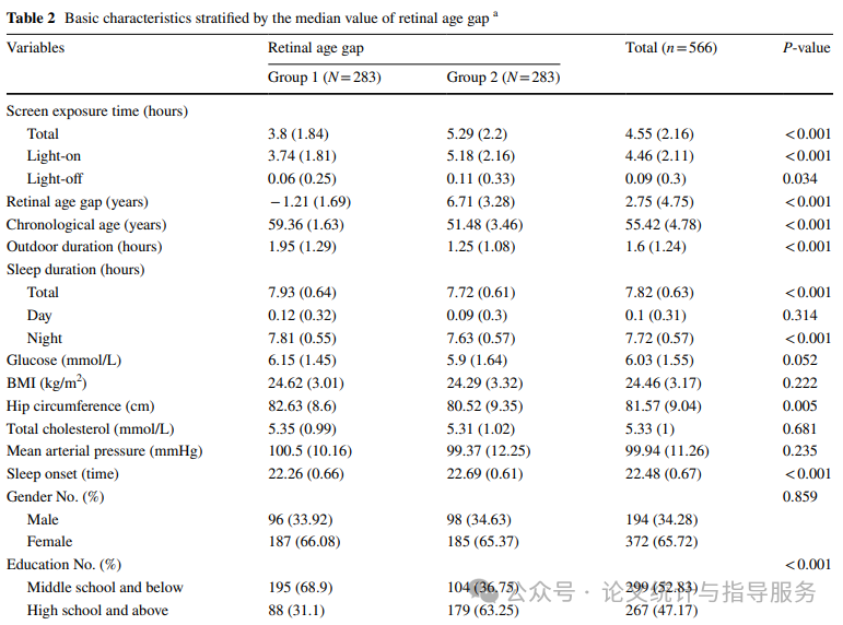 【按视网膜年龄差中位数分组的基本特征】
