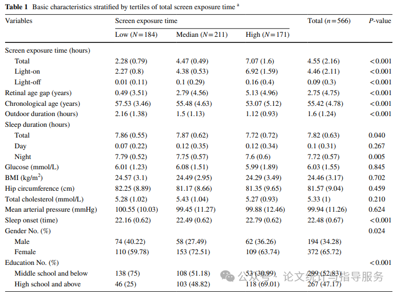 研究最终纳入566名居民,包括194名男性(34.28%)和372名女性(65.72%),平均年龄为55.42±4.78岁。平均每日总屏幕暴露时间为4.55±2.16小时,其中在亮光环境下为4.46±2.11小时,在暗光环境下为0.09±0.3小时。受试人员视网膜年龄差距、实际年龄、性别、教育水平、睡眠时间、入睡时间和户外时间在三个组之间存在统计学差异。屏幕暴露时间较高的组更年轻,受教育程度更高,户外时间更短,总睡眠时间更短,特别是夜间睡眠时间,且入睡时间更晚。