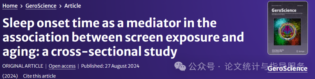2024年8月27日,同济大学医学院上海市眼科医院的研究人员在GeroScience 期刊上发表了一篇题为 “Sleep onset time as a mediator in the association between screen exposure and aging:a cross-sectional study” 的研究论文,研究探讨了屏幕时间对中年及老年人群衰老的影响。研究发现,中年及老年人群中,过度屏幕时间与视网膜年龄差距增大存在相关性,这可能与入睡时间延迟有关。