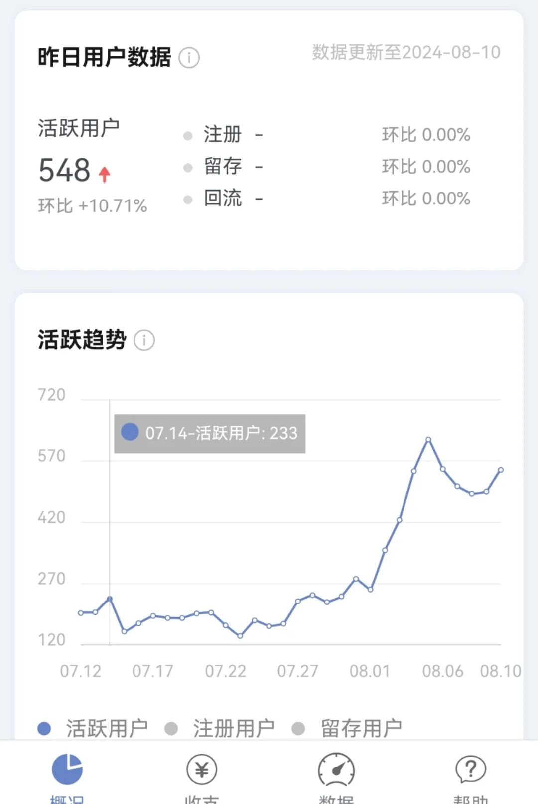 原来它每天只有一两百活跃用户,如果挂广告,应该也会有2-3R一天。这几天发现它有四五百活跃用户每天,在我的意料之外。