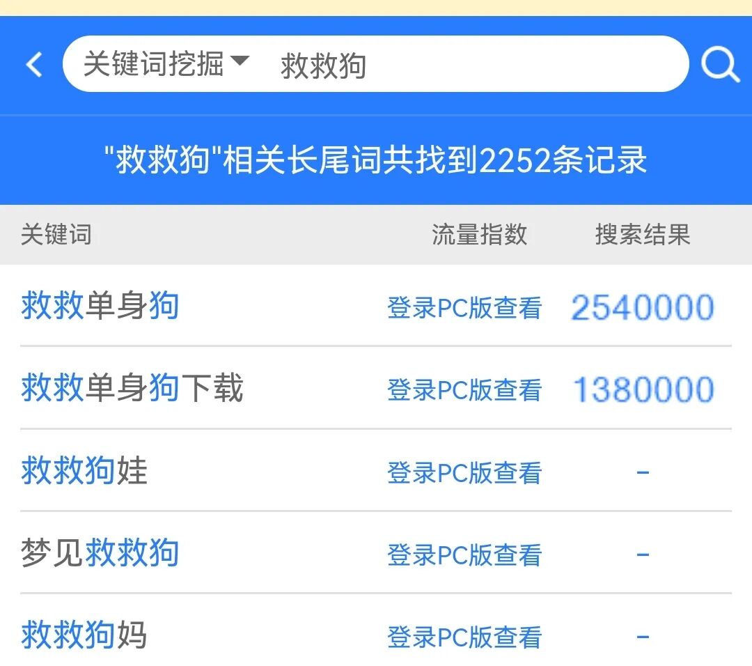 把那些和我自己领域相关的词挑选出来,例如这个救救狗,那么我把救救狗再拿去工具上搜索,查找与救救狗相关的长尾词,把这个长尾词排行榜里面,靠最前的词就是我们要找的热词。